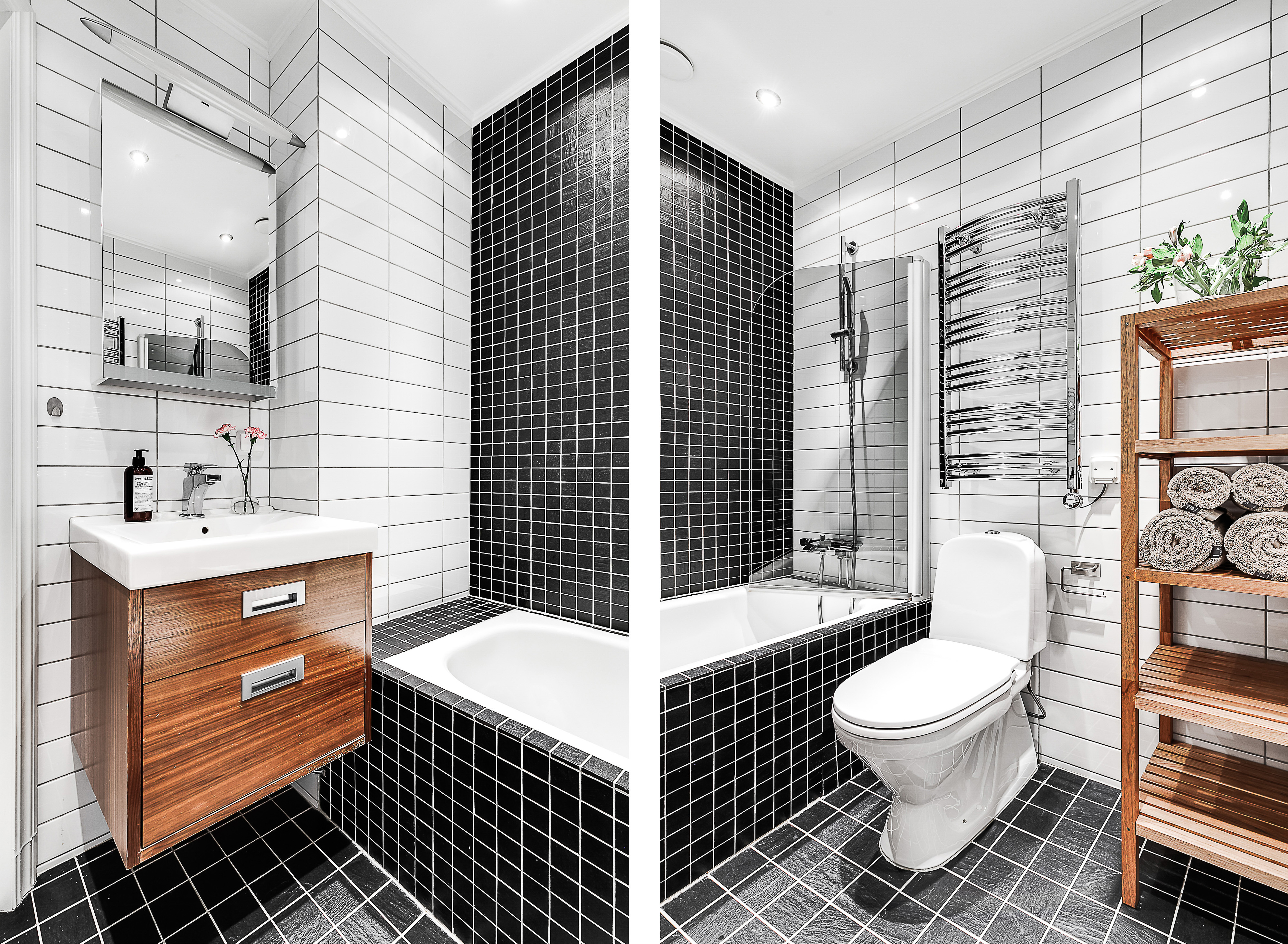 ---Stort och kaklat badrum med badkar, handfatskommod, spegelskåp, wc samt handduksvärmare. Golvvärme.