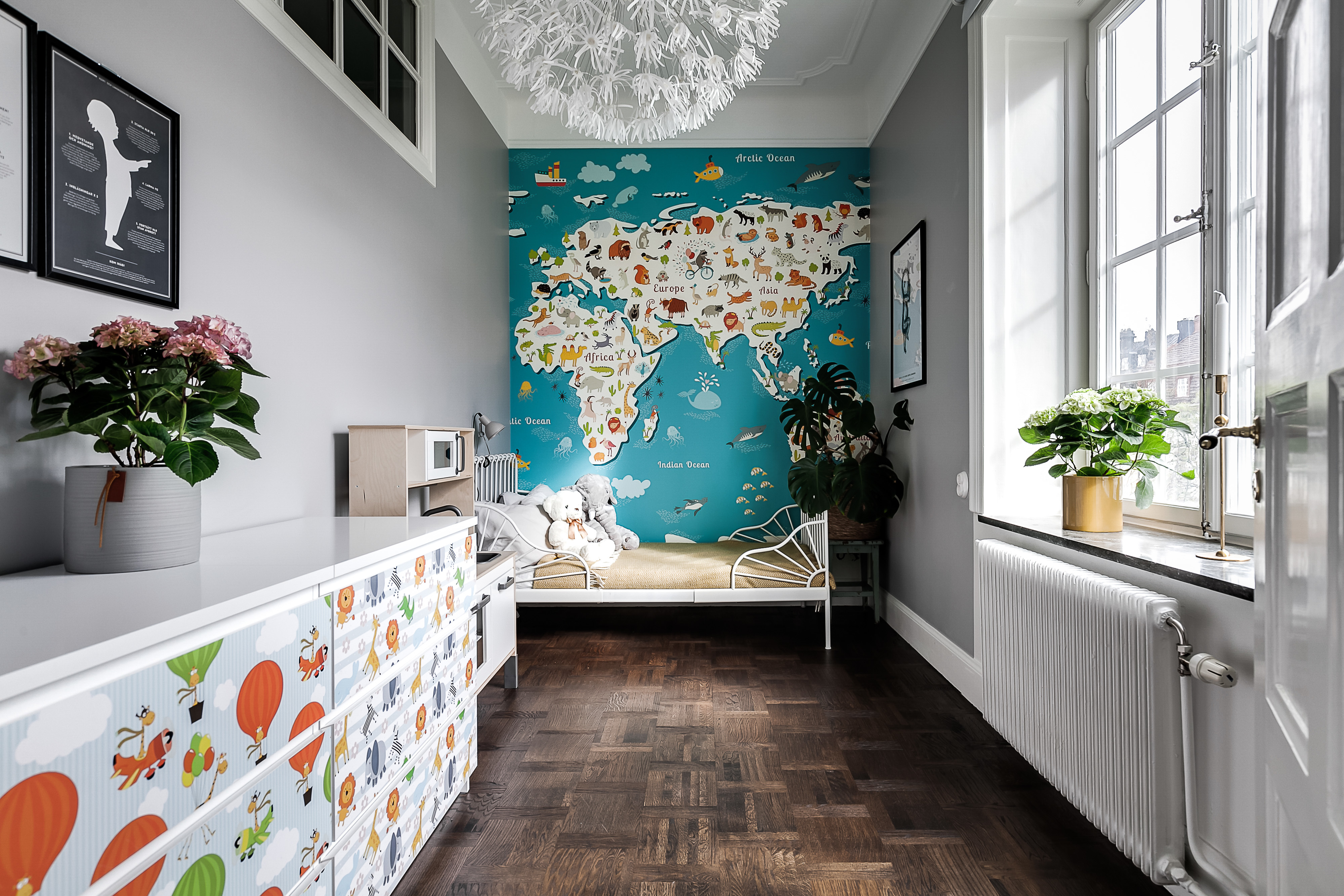 ---Mysigt barnsovrum med målade väggar samt en fin tapet i kartmotiv. Holländsk parkett. Detta sovrum är avdelat och det har man gjort med omsorg så att takrosetten ska vara intakt samt satt in ett gammalt antikt fönster för att behålla den rätta känslan.