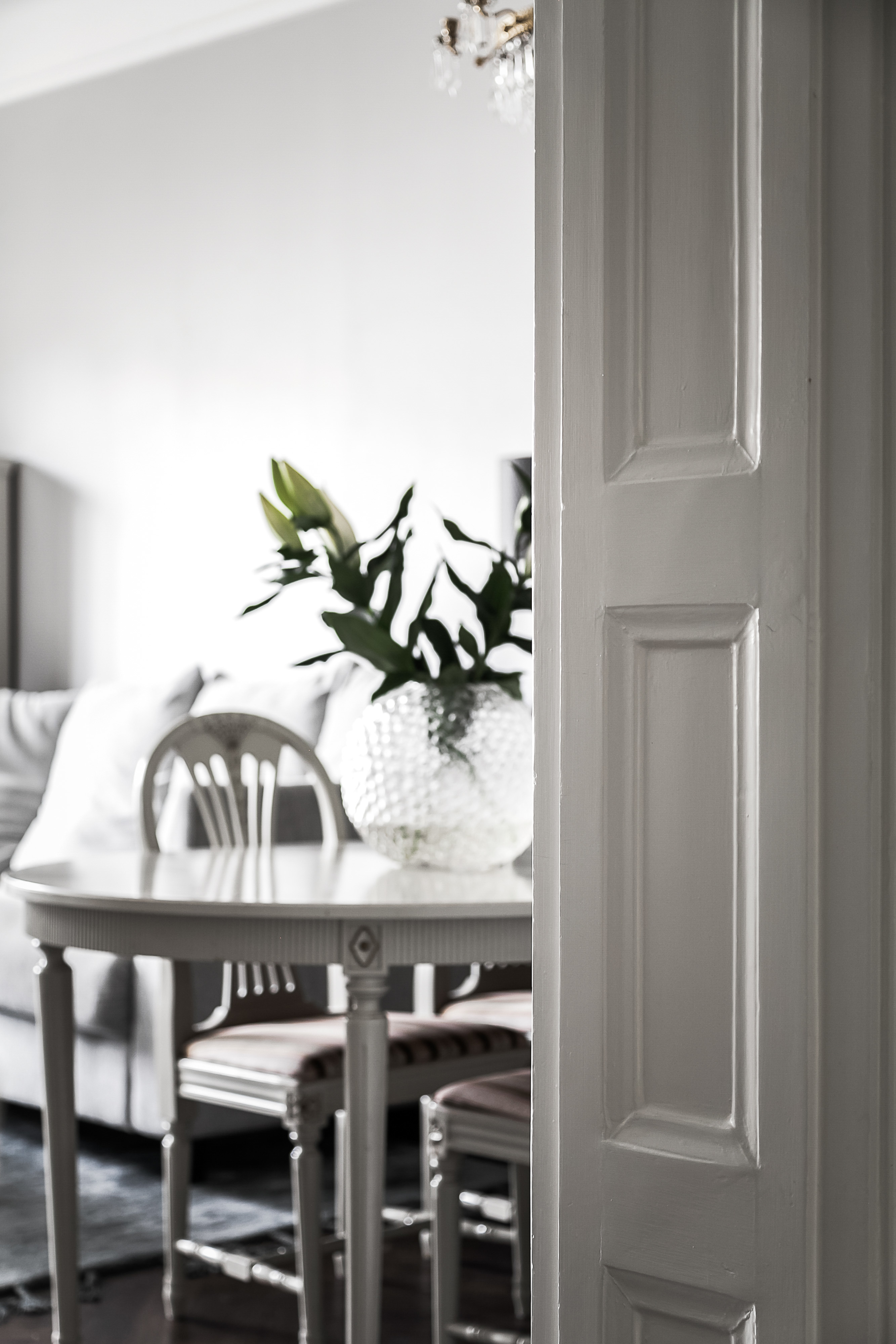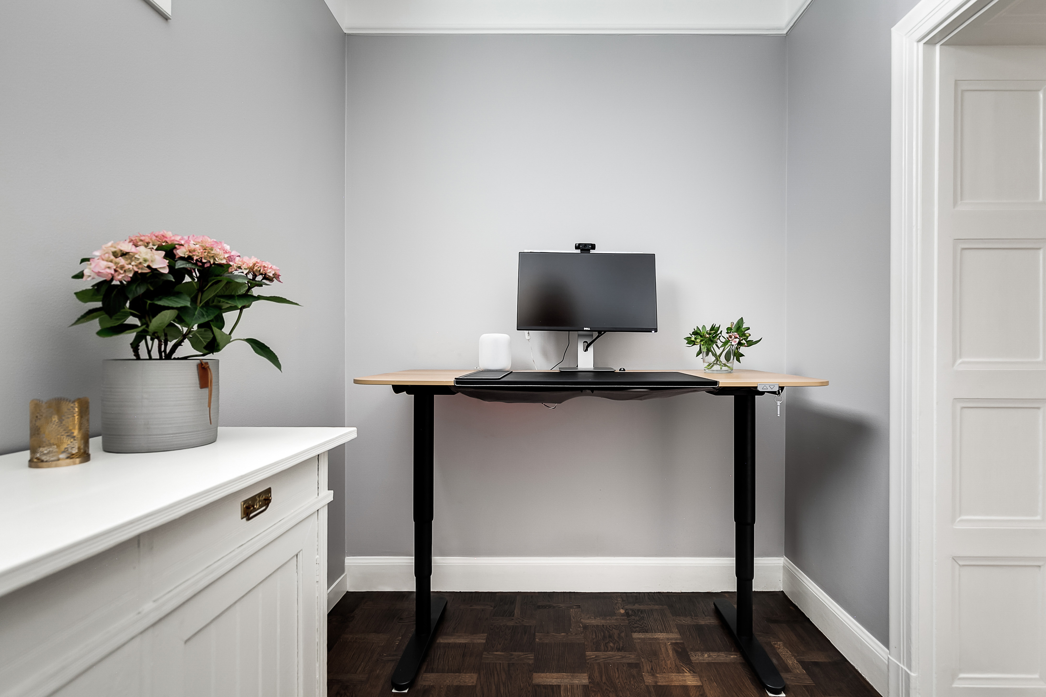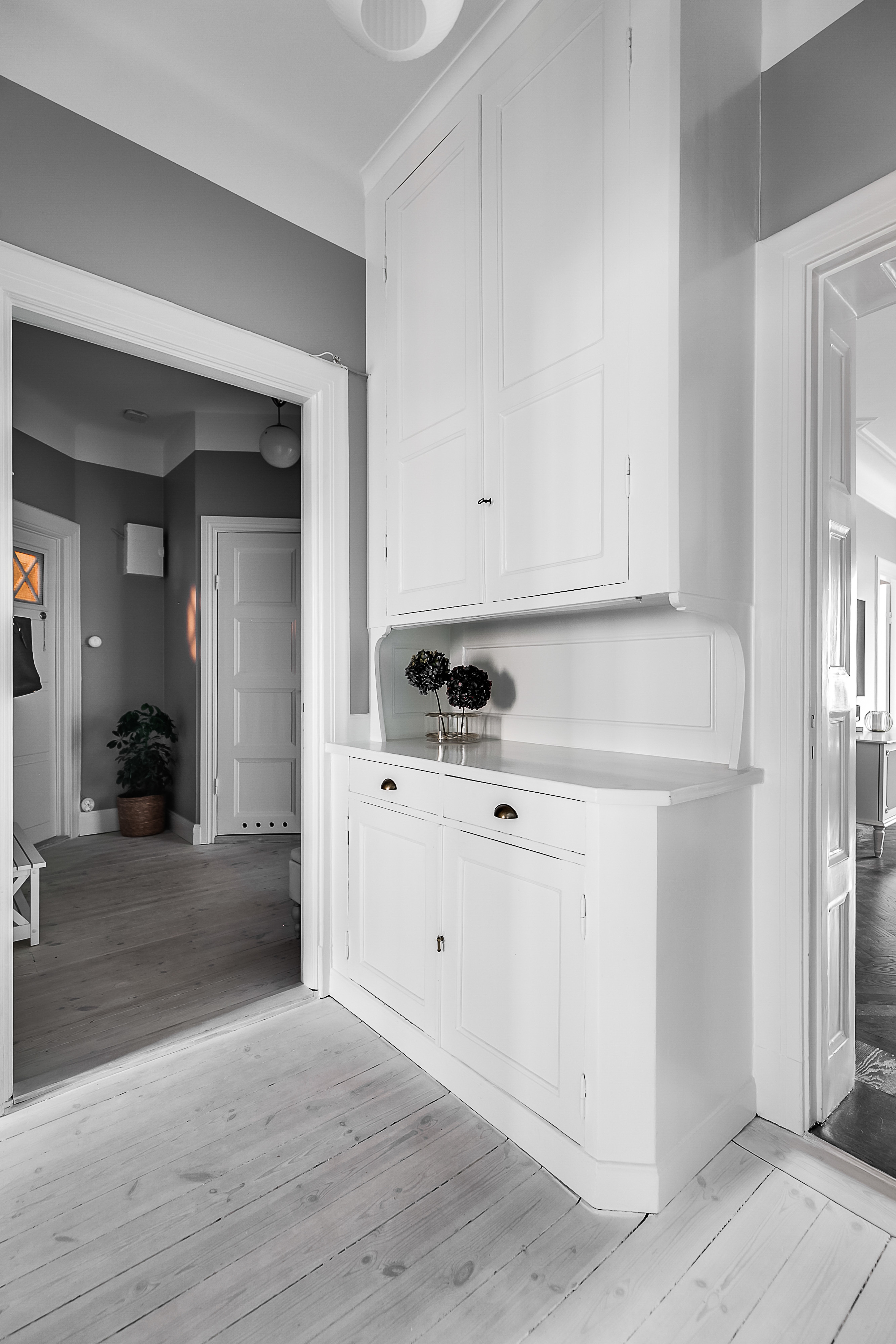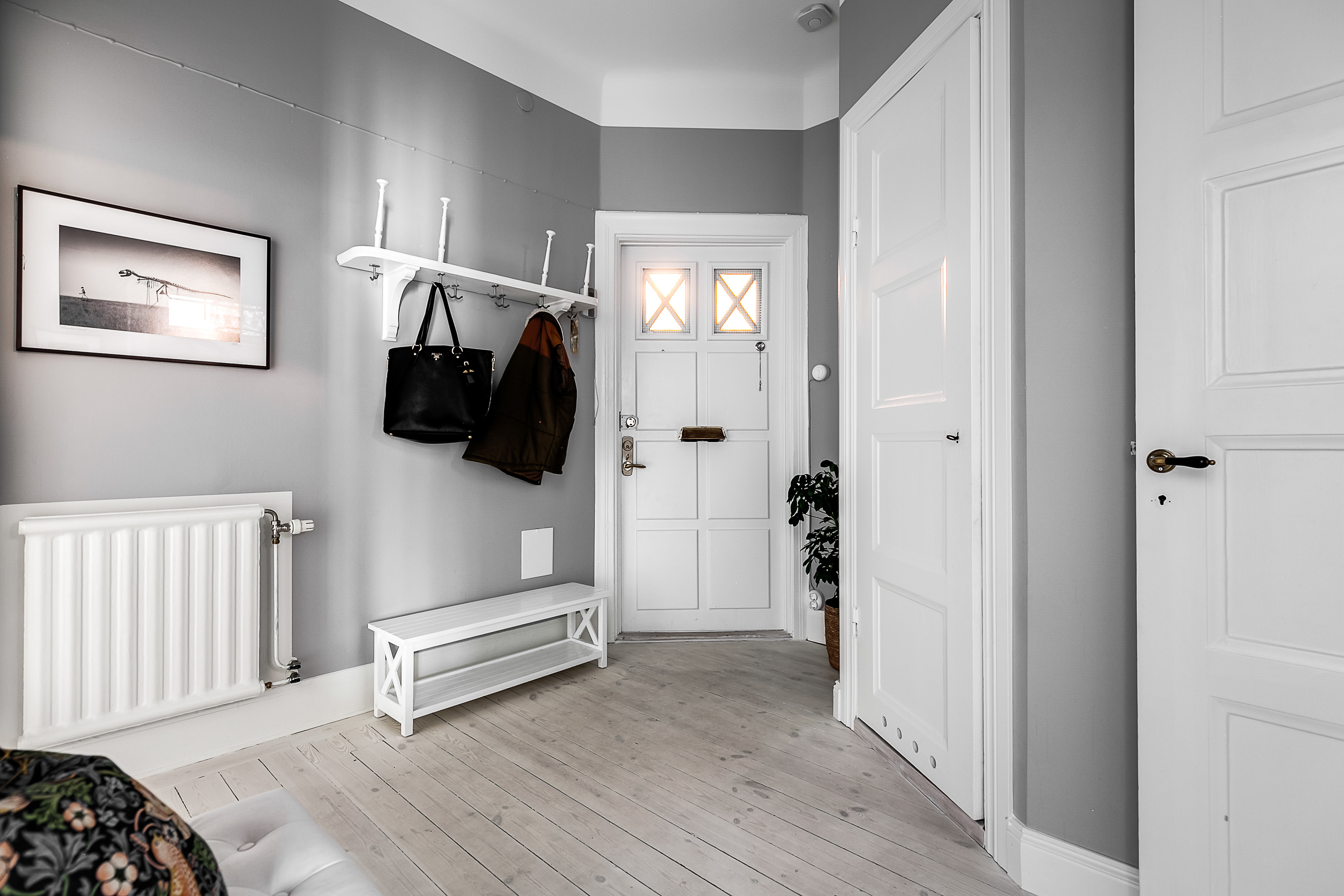 ---Inbjudande hall där man på en gång slås av lägenhetens bevarade originaldetaljer. Goda avhängningsmöjligheter samt ett bevarat serveringsskåp. Trägolv samt målade väggar.