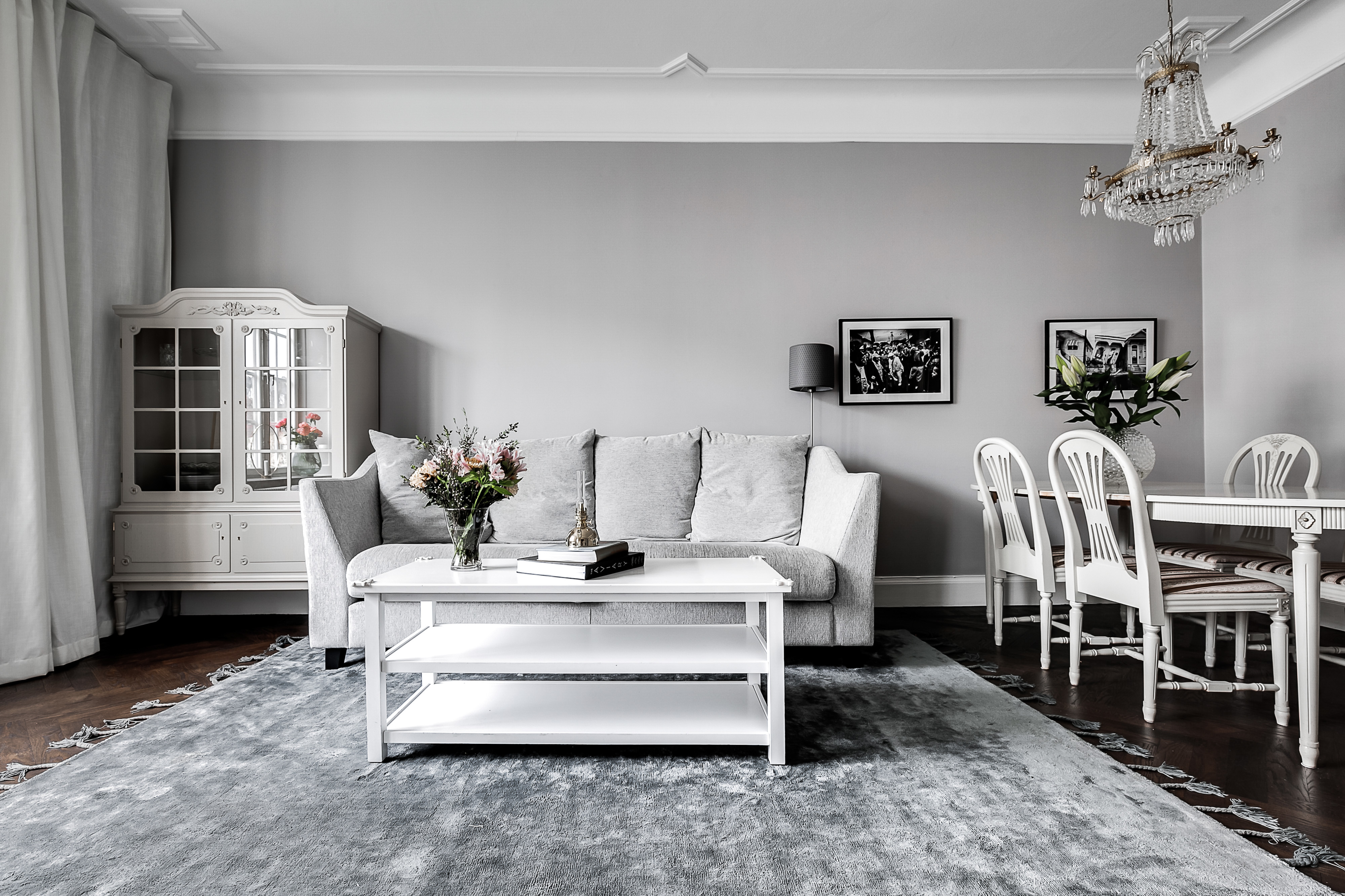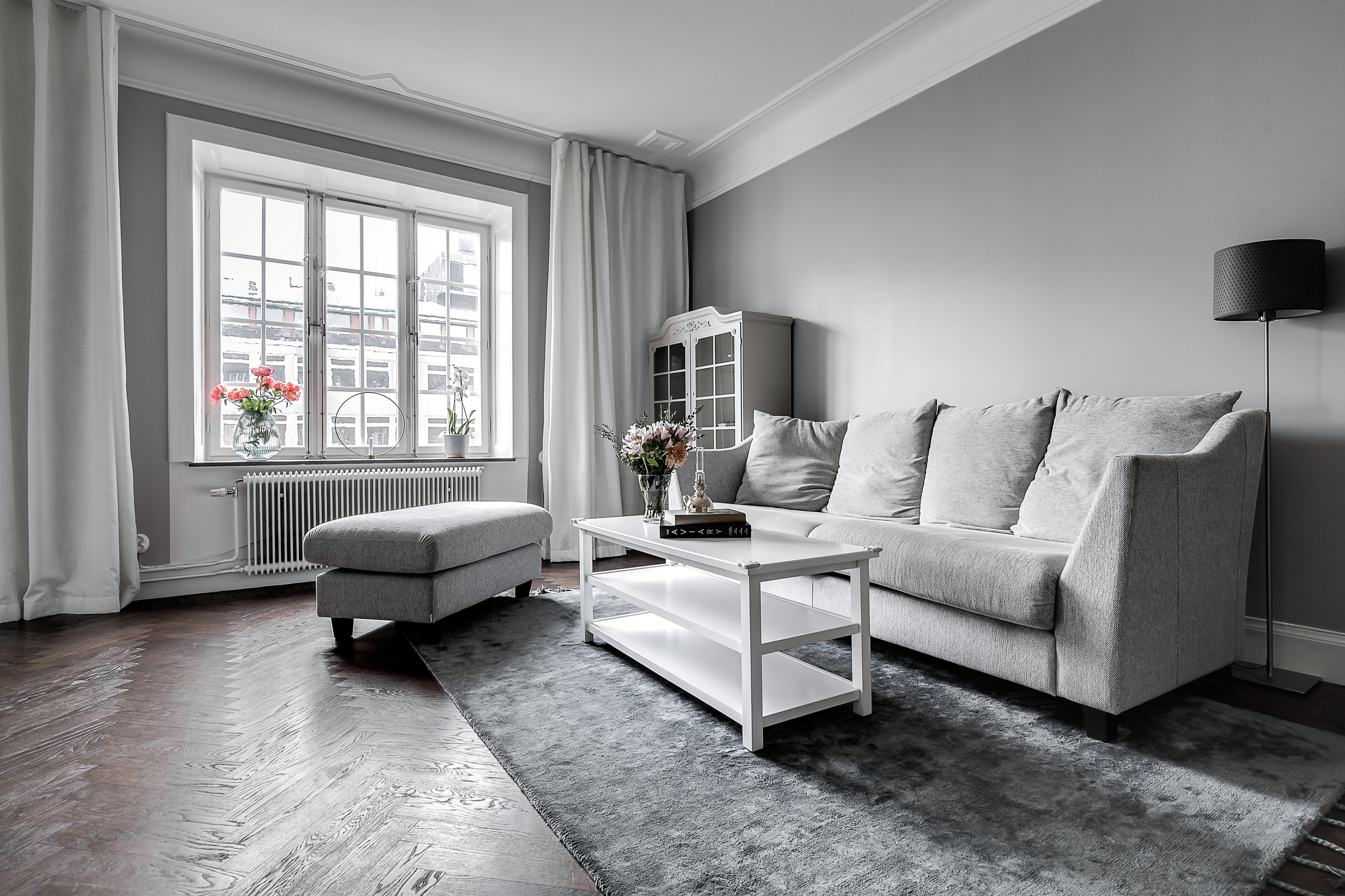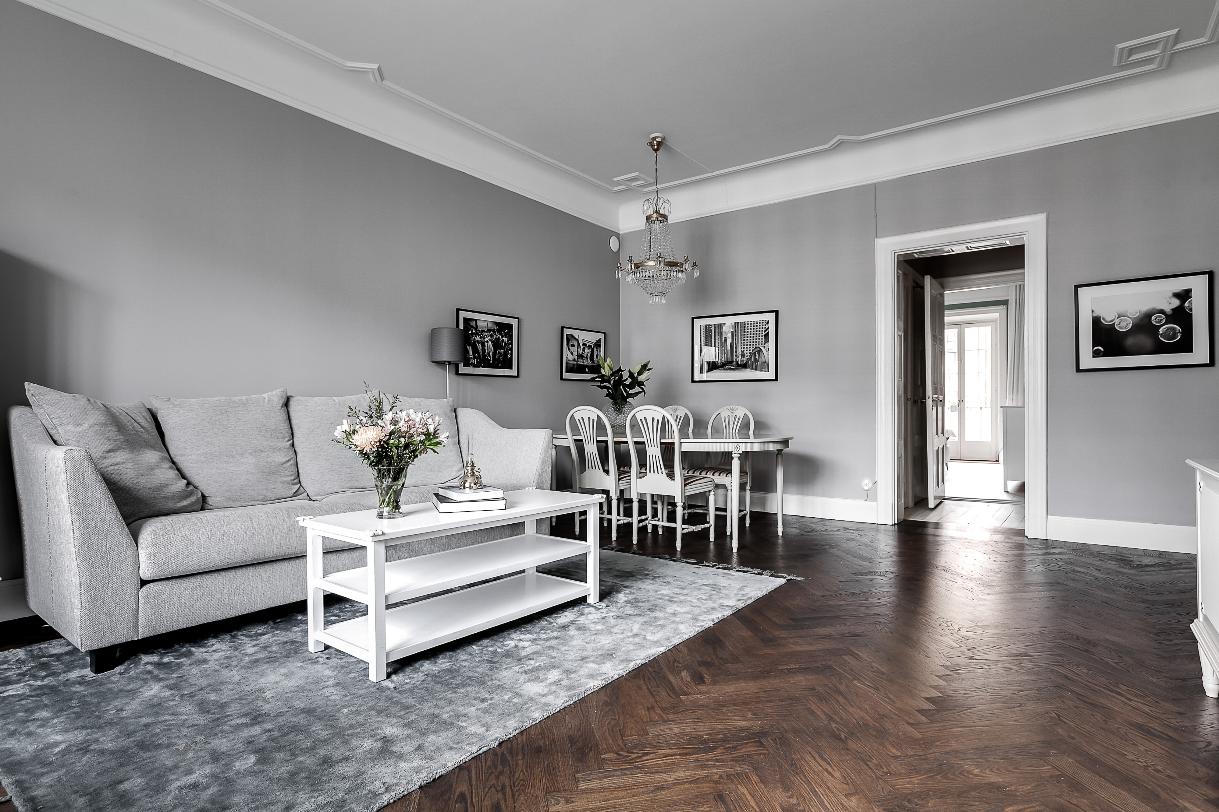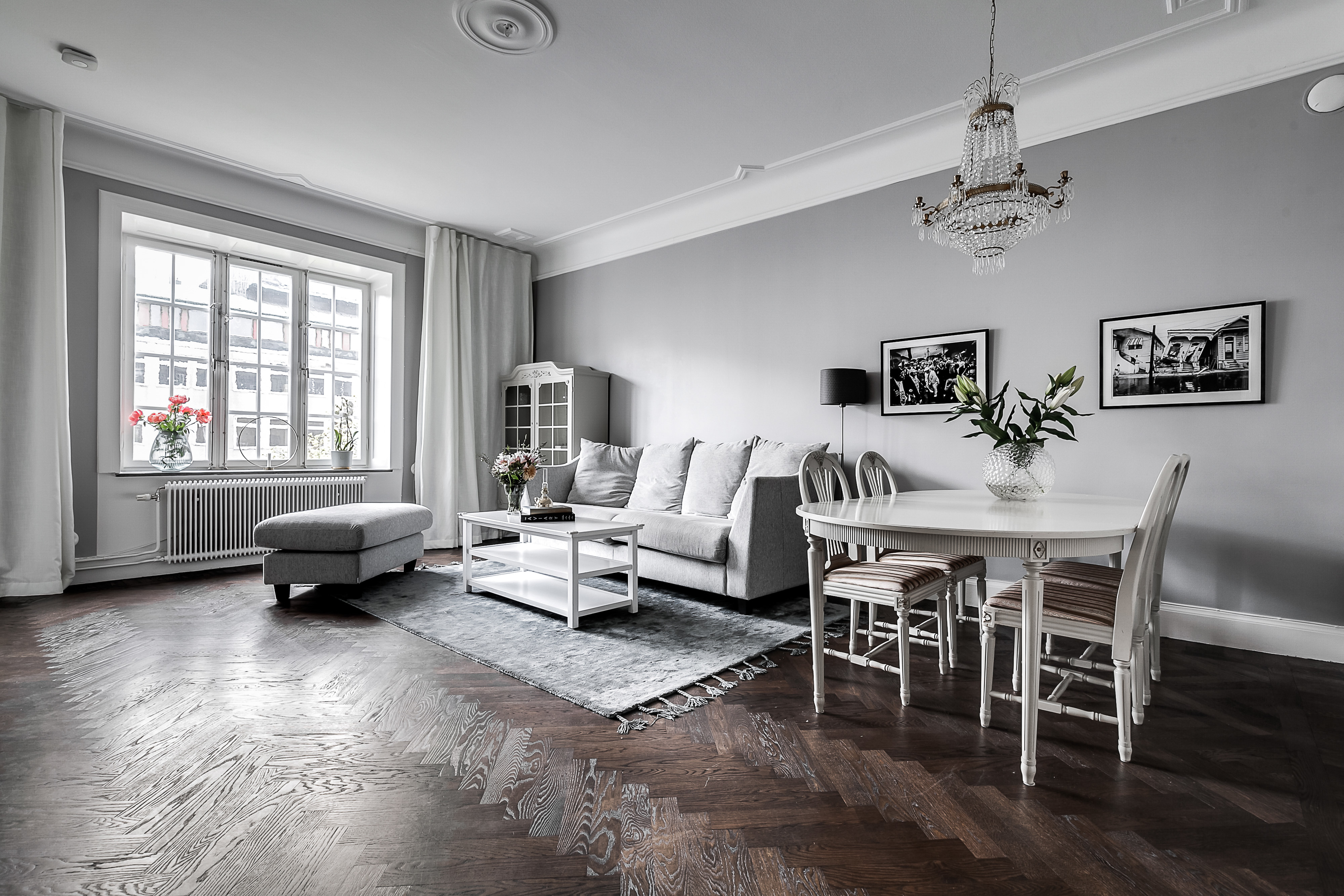 ---Luftigt och stort vardagsrum med ett majestätiskt fönsterparti invid ett lummigt fint träd. Vardagsrummet är så pass rymligt att både soffmöblemang och ett rejält matsalsbord får plats. Klassisk fiskbensparkett samt målade väggar.